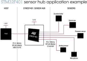 Mikrokontrolery F401/F411 wyposażono w pamięci SRAM o relatywnie dużej pojemności (do 128 kB), co - w połączeniu z szybkimi interfejsami komunikacyjnymi - ułatwia wykorzystanie m.in. ich jako inteligentne integratory sensorów (rysunek 2).
