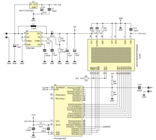 Schemat urządzenia SpectrumDFT pokazano na rysunku 1. Zaprojektowano bardzo prosty system mikroprocesorowy, którego „sercem” jest niewielki mikrokontroler firmy Microchip (dawniej Atmel) typu ATXmega16E5 odpowiedzialny za realizację całej założonej funkcjonalności. Taktowany jest wewnętrznym wysokostabilnym generatorem RC o częstotliwości 32 MHz i realizuje programową implementację 80-punktowej transformaty Fourier’a DFT, a wyniki obliczeń wyświetla w postaci wykresu widma na efektownym, graficznym wyświetlaczu OLED o rozdzielczości 128×64 piksele.