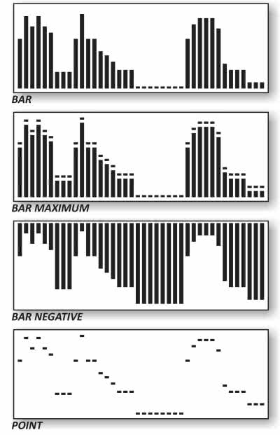 Program obsługi aplikacji urządzenia SpectrumDFT przewiduje 4 tryby wyświetlania informacji o widmie sygnału audio, których przykładowe wizualizacje przedstawiono na rysunku 3. Warto podkreślić, że tryb trzeci (Bar maximum) integruje dodatkową funkcjonalność w postaci pokazywania wartości szczytowej w każdym z 40 pasm częstotliwościowych.