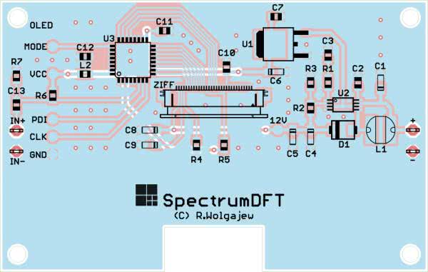 Schemat montażowy urządzenia SpectrumDFT pokazano na rysunku 4. Zaprojektowano bardzo zwarty obwód drukowany o wielkości zbliżonej do zastosowanego wyświetlacza OLED zbudowany wyłącznie z elementów SMD umieszczonych tylko po stronie BOTTOM.