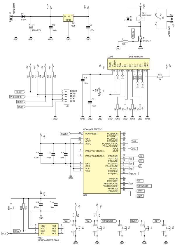 Załączaniem pompy (lub innego urządzenia, np. kontrolki sygnalizującej uzyskanie prawidłowego ciśnienia) zarządza przekaźnik elektromagnetyczny PK1. Do załączania cewki, służy niewielki tranzystor MOSFET typu BSS123. Rezystor R1 dba o to, aby tranzystor pozostał wyłączony również w czasie, kiedy mikrokontroler nie funkcjonuje, na przykład gdy znajduje się w stanie zerowania, spowodowanego zbyt niskim napięciem zasilania.