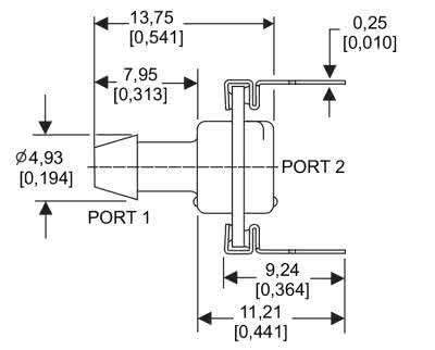 Głównym elementem urządzenia jest cyfrowy czujnik ciśnienia firmy Honeywell, oznaczony symbolem HSCDANN150PG2A5. Może on zmierzyć ciśnienie względne suchego powietrza w zakresie 0…150 psi, co odpowiada zakresowi około 0…10,34 bar. Powietrze, którego ciśnienie ma zostać zmierzone, doprowadza się do króćca PORT1, o wymiarach określonych na rysunku 2. PORT2 to otwór, którym czujnik pobiera powietrze o ciśnieniu atmosferycznym.