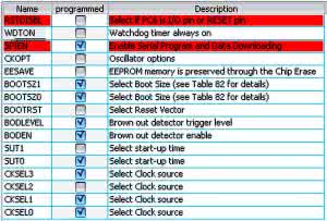 Zaznaczona kratka, to bit zaprogramowany o wartości „0”. Dzięki temu, uruchomiony zostanie wewnętrzny oscylator RC o częstotliwości 8 MHz, z możliwie długim czasem rozruchu, oraz detektor zaniku napięcia zasilającego (Brown out detector), ustawiony na wartość około 4 V. Krótkotrwałe zaniki zasilania, spowodowane np. rozruchem pompy, nie będą groziły całkowitym zawieszeniem się programu.