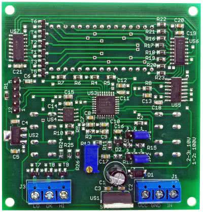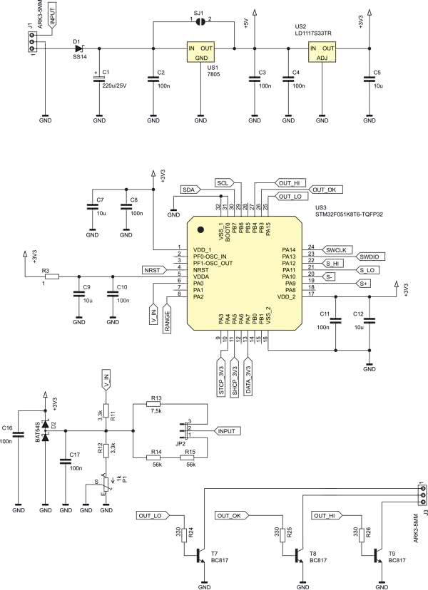 Monitorowane napięcie, podawane na zacisk 3 w złączu J1, musi zostać podzielone z użyciem prostego dzielnika rezystancyjnego, aby dopasować jego zakres do możliwości przetwornika A/C. Dla zakresu do 10 V biorą w tym udział rezystory R13 oraz R12 z potencjometrem P2. Z kolei, dla zakresu do 100 V, jako „górne” rezystory dzielnika pracują połączone szeregowo R14 i R15. Wartości wszystkich tych elementów zostały tak dobrane, że bez kalibracji (z potencjometrem P1 ustawionym fabrycznie w połowie) układ będzie wskazywał wartość zbliżoną do prawidłowej.Kondensator C17 zawęża pasmo szumowe i wygładza szybkozmienne tętnienia, co poprawi dokładność pomiarów przetwornika. Dioda D2 chroni układ przed zniszczeniem w razie podania napięcia ujemnego lub zbyt wysokiego. Rezystor R11, przez który – w czasie prawidłowej pracy – niemal nie płynie prąd, jest ostatnim zabezpieczeniem wejścia przetwornika. Jego zadaniem jest ograniczenie czasu narastania napięcia na wbudowanych w mikrokontroler diodach zabezpieczających oraz zredukowanie płynącego przez nie prądu.
