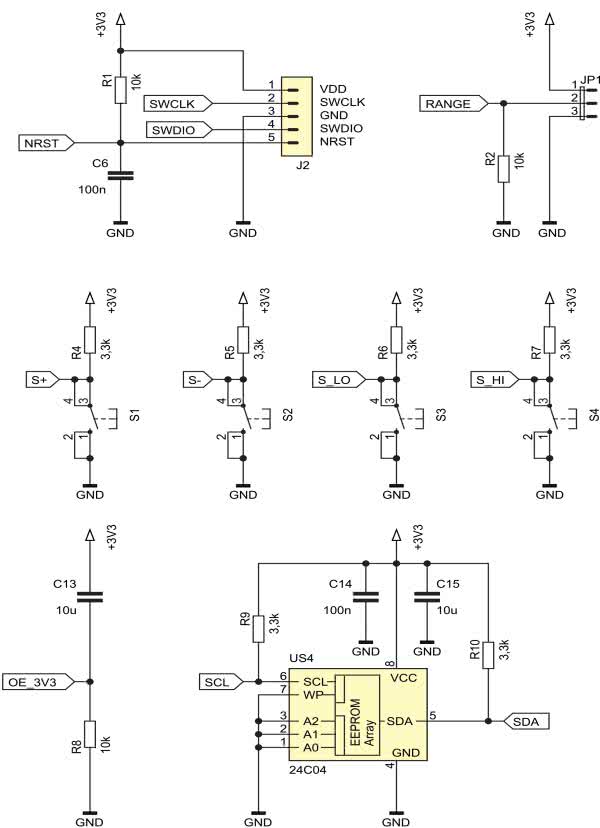 Do wygodnego ustawiania dolnego i górnego progu służą cztery przyciski monostabilne typu microswitch S1…S4. Rezystory podciągające, które znajdują się w mikrokontrolerze, mogą się okazać niewystarczające podczas pracy w zakłóconym środowisku (ich rezystancja może wynosić od 25 kΩ do 55 kΩ), dlatego dodano zewnętrzne rezystory o wartości 3,3 kΩ. Może to mieć istotne znaczenie, gdyby połączenia między nimi a płytką zostały przedłużone przy użyciu przewodów.