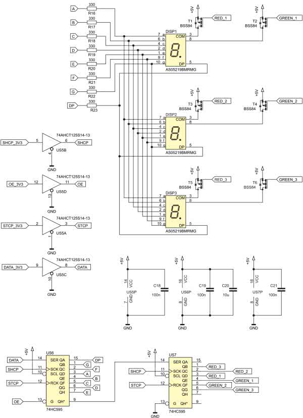 Sterowanie trzema dwukolorowymi wyświetlaczami siedmiosegmentowymi odbywa się przez dwa rejestry przesuwne typu 74HC595. Jeden z nich załącza poszczególne segmenty, a drugi całe cyfry. Zdecydowano się na zasilanie napięciem 5 V, aby móc możliwie prawidłowo kontrolować prądy poszczególnych segmentów – przy napięciu 3,3 V, na rezystorach R16… R23 odkładałoby się znacznie niższe napięcie, przez co segmenty czerwone mogłyby świecić zdecydowanie jaśniej od zielonych, gdyż płynąłby przez nie prąd o wyraźnie większym natężeniu. Anody poszczególnych cyfr są załączane przez tranzystory MOSFET z kanałem typu P. Wybrano takie rozwiązanie, ponieważ w stanie przewodzenia jest na nich niewielka strata napięcia. Ponadto, nie wymagają stosowania szeregowych rezystorów ograniczających prądy baz, co oszczędza miejsce na płytce i redukuje liczbę elementów.