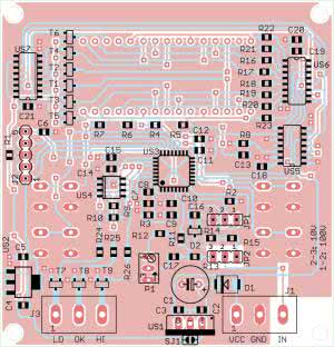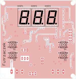 Układ został zmontowany na dwustronnej płytce drukowanej o wymiarach 72×75 mm, a jej schemat został pokazany na rysunku 2 i rysunku 3. W odległości 3 mm od krawędzi płytki znalazły się otwory montażowe o średnicy 3,2 mm.