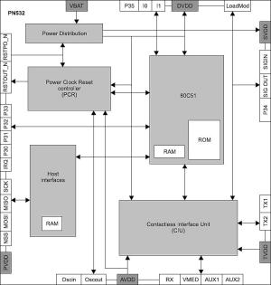 Moduł jest oparty o popularny układ PN532 firmy NXP. Odpowiada on za kompleksową obsługę kart zbliżeniowych Mifare, umożliwiając szybkie i łatwe wykonanie urządzeń NFC. Schemat blokowy układu pokazano na rysunku 1.