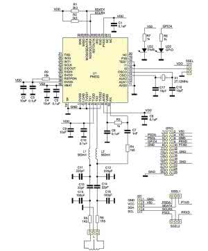 Schemat modułu NFC przedstawia rysunek 2. Moduł nie odbiega od noty aplikacyjnej NXP. Rezonator kwarcowy X1 jest elementem układu zegarowego, rezystory R3 i R6, kondensatory C6, C7, C11 i C16 dopasowują antenę i stanowią filtr EMC. Pozostałe kondensatory filtrują zasilanie. Antenę L wykonano na płytce drukowanej. Ułatwia to uruchomienie modułu uwalniając od konieczności nawijania cewek antenowych. Niestety, jest okupione nieco mniejszą dobrocią ograniczającą zasięg do ok. 3 cm w przypadku kart i 1 cm w przypadku żetonów.