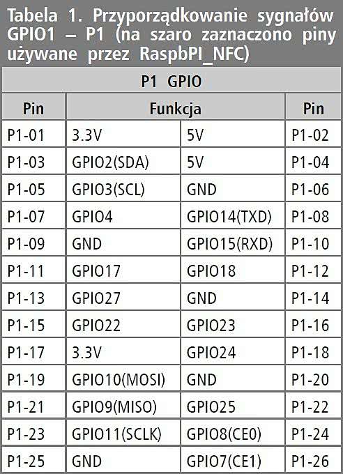 Tabela 1. Przyporządkowanie sygnałów GPIO1 - P1 (na szaro zaznaczono piny używane przez RaspbPI_NFC)