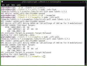Po pomyślnym zakończeniu pracy kompilatora wracamy do podkatalogu biblioteki /home/pi/libnfc-1.7.1 ( cd /utils) i wydajemy polecenie sudo ./nfc-list. Jeżeli wszystkie wcześniejsze operacje przebiegły pomyślnie i moduł jest zmontowany poprawnie, czytnik kart zostanie zainicjowany, następnie przechodzimy do katalogu cd ../examples i wydajemy polecenie sudo ./nfc-poll.