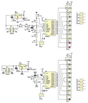 Należy pamiętać, że w trybie pracy linijka, układ pobiera większy prąd, co przy wysokim napięciu zasilania może powodować silne nagrzewanie się stabilizatora i może on wymagać radiatora. Poprawnie zmontowany miernik nie wymaga uruchamiania. Uwaga! Rezystory R6 i R11 są konieczne tylko wtedy, gdy pierwsza dioda danej linijki zawsze się lekko świeci.