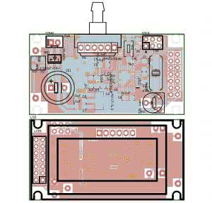 Układ wskaźnika zmontowano na niewielkiej, dwustronnej płytce drukowanej. Jej schemat montażowy pokazano na rysunku 4. Wyświetlacz i przetwornik wlutowane są bezpośrednio do płytki. W zależności od zastosowanego wyświetlacza, w przypadku, gdy nie ma możliwości odwrócenia polaryzacji podświetlenia na płytce LCD, można wlutować rezystory R2 i R3 odwrócone o 90 stopni (obszar przy rezystorach R2 i R3 oznaczony kwadratem).