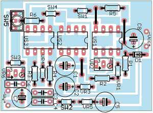 Na wyjściu US3 został dodany SW4 przełącznik dwuobwodowy dźwigienkowy, do którego zewnętrznych pinów połączonych "na krzyż" przylutowano diodę, a dwa piny środkowe dołączono do wejścia sterowania napięciowego (nóżka 5) i wyjścia układu NE555 (nóżka 3).