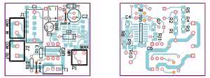 Układ został zmontowany na jednostronnej płytce drukowanej o wymiarach 45 mm×39 mm, której wzór ścieżek widnieje na rysunku 2. Montaż należy zacząć od elementów lutowanych powierzchniowo, które znajdują się od spodniej strony płytki. Dopiero wtedy można przystąpić do montażu elementów przewlekanych, poczynając od dwóch zworek z drutu.