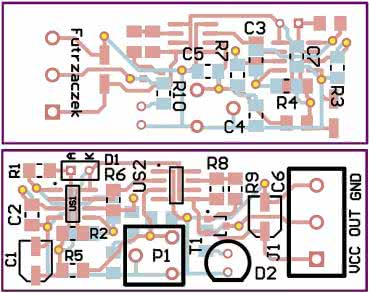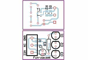 Płytka układu odbiornika ma wymiary 50 mm×20 mm i jest dwustronna, a nadajnika jednostronna o wymiarach 21 mm×30 mm. Schemat montażowe płytek zamieszczono na rysunku 4 i rysunku 5.