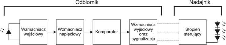 Wzmocniony i odfiltrowany sygnał jest podawany na wejście komparatora, który porównuje jego wartość chwilową z napięciem ustalonym dzielnikiem R5-P1. Jeżeli okaże się większa, wyjściowy tranzystor nasyca się, potencjał wyjścia spada niemal do zera i załącza się tranzystor T1. To powoduje zaświecenie się diody elektroluminescencyjnej oraz załączenie diod nadawczych na płytce nadajnika.