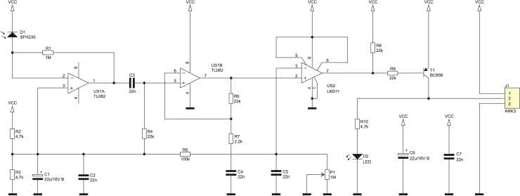 Za odbiór sygnału z fotodiody jest odpowiedzialny jeden wzmacniacz z układu TL082. Został on wybrany z uwagi na parametr Slew-Rate, co przy pracy z sygnałami impulsowymi ma duże znaczenie oraz przystępną cenę. Masę pozorną dla całego odbiornika wytwarza dzielnik rezystorowy R1/R2, a kondensatory C1 i C2 zmniejszają jego impedancję wewnętrzną. Układ C3-R4 jest filtrem górnoprzepustowym, odcinającym jednocześnie zmiany składowej stałej na wyjściu US1A wywołane np. padającymi promieniami słonecznymi. Częstotliwość graniczna tego filtru to ok. 330 Hz, czyli dużo mniej niż częstotliwość sygnału użytecznego.