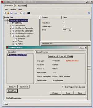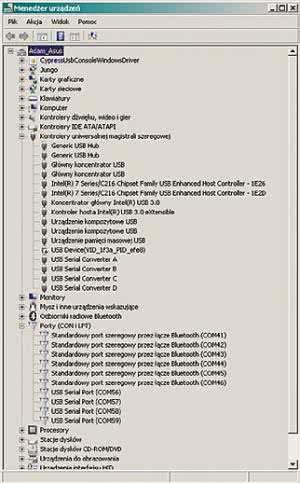 Po poprawnym montażu i podłączeniu do komputera PC, w przypadku systemu Windows drivery instalowane są automatycznie (rysunek 3). Po prawidłowym zainstalowaniu należy skonfigurować układ FTDI4232 za pomocą oprogramowania FT_Prog (rysunek 4) ustawiając drivery portów szeregowych w trybie VCP (powinien być ustawiony domyślnie) zwiększając zakres pobieranego prądu z USB do 500 mA i wydajność I/O do 8 mA. Przykładowy szablon ustawień układu jest dołączony do dokumentacji (plik USB_4UART.xml).