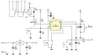 Schemat ideowy modułu włącznika pokazano na rysunku 1. Zbudowany go w oparciu o mikrokontroler PIC12F675. Napięcie zasilania jest podawane na cewkę przekaźnika oraz na stabilizator napięcia IC1, który zasila mikrokontroler.
