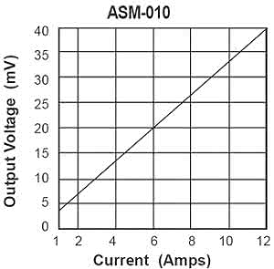W projekcie użyto przekładnika prądowego ASM-010 produkcji TALEMA. Jest on lutowany w płytkę drukowaną i przystosowany do mierzenia prądu z zakresu 1...10 A o częstotliwości 50/60 Hz. Nota katalogowa zaleca obciążenie go rezystorem o rezystancji 50 Ω, a wtedy napięcie na jego zaciskach jest liniową funkcją prądu, zgodnie z charakterystyką pokazaną na rysunku 1, również zaczerpniętą z tej noty. Na wyjściu występuje napięcie sinusoidalne, przemienne, o amplitudzie nie większej niż kilkadziesiąt miliwoltów. Rolą układu, którego schemat widnieje na rysunku 2, jest jego wzmocnienie i wyprostowanie.