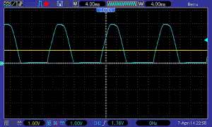 Na rysunku 4 pokazano oscylogram przedstawiający napięcie z wyjścia "PULSE" (przebieg niebieski) oraz z wyjścia "DC" (przebieg żółty). Przez przewód w przekładniku płynął prąd o wartości skutecznej 3,5 A zasilający odbiornik rezystancyjny z sieci 230 V.