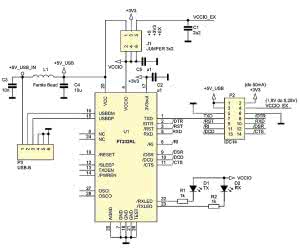 Schemat ideowy układu pokazano na rysunku 1, natomiast rozmieszczenie elementów na płytce drukowanej przedstawiono na rysunku 2. Głównym elementem konwertera jest układ U1 typu FT232RL w 28-wyprowadzeniowej obudowie SSOP. Ten sam układ był zastosowany w konwerterze AVT-1595 (EP 10/2010). Podobnie jak tam, do doprowadzenia sygnału USB użyto gniazda typu B (złącze P3).