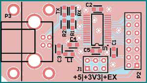 - Na złączu IDC14 (P2) udostępniono wszystkie sygnały interfejsu RS232 (bez zachowania zgodności poziomów napięcia ze specyfikacją EIA-232).