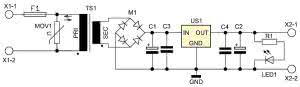 W układzie można wykorzystać dowolny stabilizator z rodziny 78XX w obudowie TO220. Napięcie po stronie wtórnej transformatora TS1 należy dobierać tak, aby było, co najmniej równe pożądanemu poziomowi napięcia wyjściowego zasilacza. W przypadku wydajności prądowej zasada jest taka, aby maksymalna wydajność prądowa była przynajmniej 1,5 raza większa od zakładanego obciążenia. Takie rozwiązanie zapobiegnie ewentualnemu przegrzaniu i nieodwracalnemu uszkodzeniu transformatora.