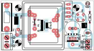Projekt płytki PCB przewiduje montaż transformatorów z serii TS2/XX np. TS2/14, TS2/15 oraz zalewanych do druku o mocach od 1,5...8 VA. Schemat montażowy zasilacza pokazano na rysunku 2. Całość zmontowano na jednostronnej płytce drukowanej o wymiarach 46 mm×85 mm.
