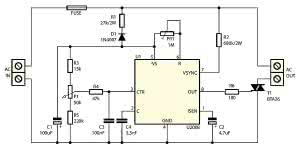 Dioda D1 pełni rolę prostownika jednopołówkowego i z rezystorem R1 ogranicza napięcie zasilania do bezpiecznej wartości. Kondensator C1 filtruje napięcie zasilające, C2 jest odpowiedzialny za tzw. miękki start. Rezystory R3, R5 i potencjometr P1 służą do ustalenia wielkości mocy dostarczonej do obciążenia.