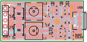 Układ zmontowany jest na dwustronnej płytce drukowanej, której schemat montażowy zamieszczono na rysunku 2. Sposób montażu jest typowy i nie wymaga opisywania. Poprawnie zmontowany działa od razu po włączeniu zasilania.