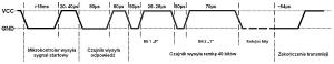 Zasilanie termometru jest czerpane ze złącza USB, dlatego konieczne było wykonanie filtru z koralika ferrytowego K1 oraz kondensatora C5. Na rysunku 2 pokazano przebieg transmisji. Komunikacja z czujnikiem rozpoczyna się od wysłania sygnału startowego składającego się z poziomu niskiego trwającego co najmniej 18 ms oraz wysokiego przez 20...40 ms.
