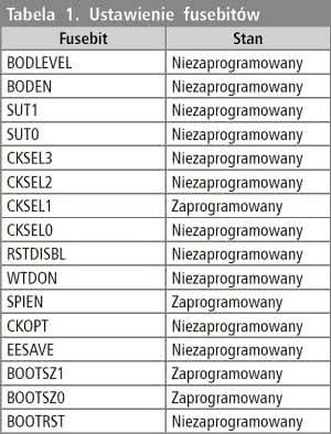 Wszystkie potrzebne sygnały do programowania mikrokontrolera zostały wyprowadzone na złączu szpilkowym Z1, dzięki czemu nie trzeba programować mikrokontrolera przed wlutowaniem. Bity konfiguracyjne mikrokontrolera należy ustawić zgodnie z tabelą 1 (fuse high byte: 0xD9, fuse low byte: 0xFD).