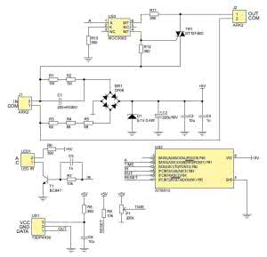 Testy wykazały, że MOC3062 (wymagający 10 mA) również działa poprawnie. Zasilacz beztransformatorowy został zaprojektowano tak, aby dostarczał napięcie ok. 5 V niezbędne do poprawnego działania mikrokontrolera. Rezystory R1 i R2 rozładowują kondensator C1 po wyłączeniu zasilania, zaś R3...R5 ograniczają udar prądowy w momencie włączenia zasilania.