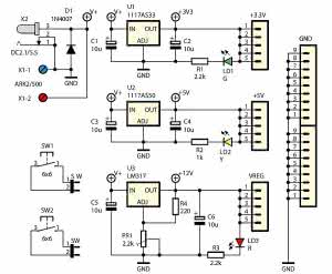 Pojemności C1...C6 pełnią funkcję filtrów zasilania. Napięcie wejściowe podawane ze złącza śrubowego X1 lub złącza X2 DC2.1/5.5 trafia na trzy stabilizatory U1... U3. Dwa pierwsze LD1117 dostarczają napięcie +3,3 V i +5 V, a trzeci - LM317 - dostarcza napięcie VREG z zakresu od 1,25 V do około 10,5 V przy zasilaniu 12 V i około 13,5 V przy 15 V.