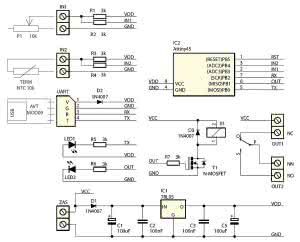 Schemat ideowy termostatu zamieszczono na rysunku 1. Jest on uproszczony do maksimum i nie wymaga komentarza. Poza tym, najważniejszego komponentu urządzenia nie widać na schemacie - jest nim program zawarty w pamięci mikrokontrolera.