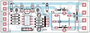 Zastosowanie przekaźnika ma wiele zalet, ale ogranicza zasilanie do 12 VDC. Zamiast przekaźnika można zamontować trzy zwory z drutu opisane na płytce - wtedy elementem wykonawczym będzie tranzystor MOSFET T1. Bez dodatkowego radiatora może załączać prąd do ok 5 A. Do złącza OUT1 należy doprowadzić zasilanie z przedziału 7...25 V, na złączu OUT2 pojawi się napięcie w czasie załączenia wyjścia, które sygnalizuje dioda LED2.