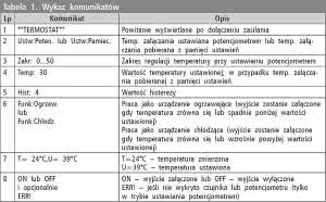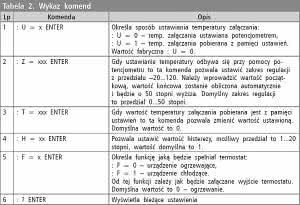 Co ok. 2 sekundy w oknie Receive terminala powinna być wyświetlana ramka o treści: T= 26*C,U= 30*C, OFF. Oznacza to, że komunikacja została nawiązana prawidłowo. W tabeli 1 umieszczono są wszystkie komunikaty wysyłane przez urządzenie, a w tabeli 2 komendy, za pomocą których można zmienić ustawienia.