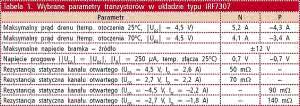 Jako elementy wykonawcze pracują tranzystory IRF7307 produkcji International Rectifier. W obudowie SO-8 zamknięte zostały dwa tranzystory typu MOSFET: jeden z kanałem P i drugi, z kanałem N. Niektóre ich parametry zostały wymienione w tabeli 1.