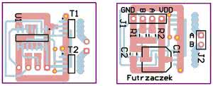 Układ został zmontowany na dwustronnej płytce drukowanej o wymiarach 22×25 mm, której wzór ścieżek widoczny jest na rysunku 2. Nie są wymagane jakiekolwiek czynności uruchomieniowe, układ jest od razu gotowy do pracy.