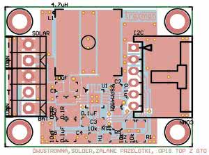 Urządzenie zmontowano na niewielkiej, dwustronnej płytce drukowanej. Rozmieszczenie elementów pokazano na rysunku 4. Montaż nie wymaga opisu. Istotne jest prawidłowe przylutowania pada termicznego U1. W przypadku pracy z prądami ładowania przekraczającymi 800 mA, należy do U1 dokleić niewielki radiator BGA z blaszki miedzianej.