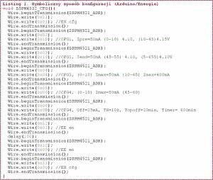 Przepisanie zawartości CONFIG1...CONFIG5 do wewnętrznej pamięci EEPROM jest możliwy po ustawieniu bitu D0=1, czyli flagi EE_PROG w rejestrze EEPROM_CTRL (12h). Domyślnie zapis jes zablokowany: EE_PROG=0. Zapis możliwy jest tylko gdy ustawiona jest flaga EN_CFG. Symboliczny sposób konfiguracji (Arduino/Energia) przedstawia lisitng 1.