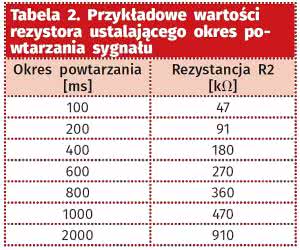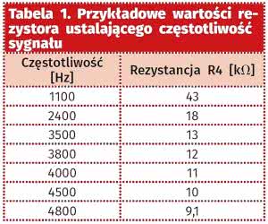 W tabeli 1 umieszczono przykładowe wartości rezystora R4 dla określonych częstotliwości rezonansowych elementu piezoelektrycznego przy zachowaniu niezmienionej wartości kondensatora C5. Są one zaokrąglone do szeregu E24. Układ prototypowy został dostosowany do częstotliwości 2,4 kHz.