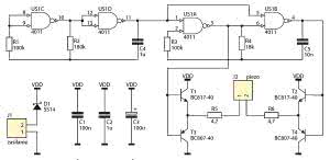 Układ generuje sygnał o ustalonej częstotliwości, rzędu kiloherców, który jest cyklicznie przerywany. Generowany dźwięk nie jest jednostajny, dlatego nasz zmysł słuchu znacznie lepiej zwraca nań uwagę. Schemat ideowy sterownika znajduje się na rysunku 1. Bramki US1C oraz US1D mają połączone wejścia, przez co zachowują się jak bramki NOT. Rezystor R2 i kondensator C4 ustalają częstotliwość pracy tak powstałego generatora fali prostokątnej. Jej częstotliwość jest niska, rzędu pojedynczych herców i służy do uruchamiania drugiego generatora.
