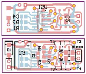 Analogicznie można modyfikować rezystancję R2, która odpowiada za okres powtarzania sygnałów dźwiękowych. W prototypie wynosi on ok. 400 ms. Tabela 2 zawiera przykładowe wartości tego rezystora. Sterownik syreny został zmontowany na dwustronnej płytce drukowanej o wymiarach 36 mm×15 mm, której schemat montażowy zamieszczono na rysunku 2. Na płytce zostało przewidziane miejsce na położenie kondensatora C3. Żaden z elementów nie nagrzewa się w odczuwalnym stopniu, dlatego nie trzeba się martwić o chłodzenie układu w przypadku chęci zamknięcia go w hermetycznej obudowie.
