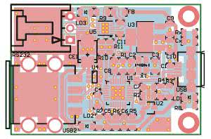 Skutkuje to zmniejszeniem powierzchni zajmowanej przez interfejs konwertera USB/UART do niezbędnego minimum. W układzie wykorzystane są tylko sygnały RXD/TXD dla transmisji bez potwierdzenia sprzętowego. Dioda świecąca LD3 (RTX) sygnalizuje aktywną komunikację. Układ jest zasilany napięciem 3,3 V poprzez filtr złożony z dławika FB i kondensatora C11. Sygnały RXD/TXD wyprowadzone są na złącze EH (UART). Należy pamiętać, że FT234 pracuje z sygnałami o napięciu 3 V i dołączenie do systemów zasilanych z 5 V (np. Arduino) wymaga użycia konwertera.