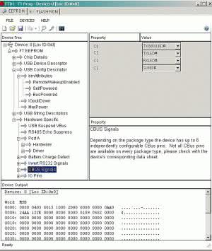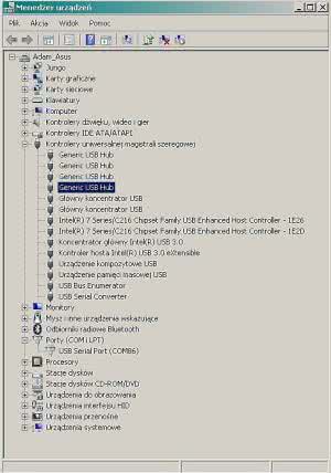 Układ nie wymaga uruchamiania. Po przyłączeniu do PC instalacja przebiega automatycznie, a po zakończeniu w Menedżerze Urządzeń systemu Windows (rysunek 3) powinny być widoczne urządzenia Generic USB Hub i USB Serial Converter. Sterowniki portu VCP domyślnie są aktywne, ale warto sprawdzić to w karcie właściwości urządzenia (USB Serial Port). Po poprawnej instalacji, należy pobrać ze strony FTDI najnowszą wersję programu FT_Prog i uruchmić go. Po przeskanowaniu urządzeń (klawisz F5) należy załadować przygotowany szablon USB_RSHub.xml i po skanowaniu ustawić w opcjach Hardware SpecificCBUS Signals C0=TX&RXLED#, zaprogramować układ (CTRL+P) i ponownie dołączyć hub do portu USB. Od tego momentu, po odświeżeniu przez system urządzeń USB, konwerter jest gotowy do pracy. Szybkiego sprawdzenia można dokonać terminalem, mostkując RXD/TXD, oraz wybierając transmisję bez sprzętowego potwierdzenia, testowe znaki powinny wracać do terminala. Aktywna transmisja powinna być sygnalizowana diodą RTX.