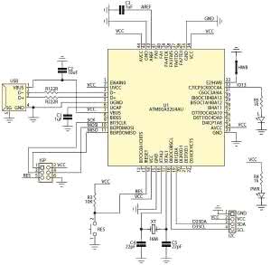 Moduł powstał z myślą o szybkim i komfortowym uruchamianiu urządzeń z interfejsem I²C. Jego schemat ideowy zamieszczono na rysunku 1. Układ jest uproszczoną - tylko do obsługi magistrali I²C - wersją Arduino Leonardo. Poza procesorem ATmega32U4 zawiera tylko złącza USB z układem polaryzacji, oscylator kwarcowy, złącze I²C, przycisk zerowania i dwie diody LED: jedną sygnalizującą załączenie zasilania, drugą "L" do wykorzystania programowo.