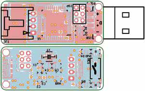 Moduł zmontowano na niewielkiej, dwustronnej płytce drukowanej w formie "klucza" wtykanego bezpośrednio do portu USB. Interfejs I²C oraz zasilanie +5 V wyprowadzono na złącze EH zgodne z Arduino. Rozmieszczenie elementów pokazano na rysunku 2. Układ zmontowany ze sprawnych elementów nie wymaga uruchamiania, należy tylko zaprogramować procesor bootloaderem Leonardo. Po zaprogramowaniu procesora złącze ISP można wylutować, zmniejszając wysokość modułu.